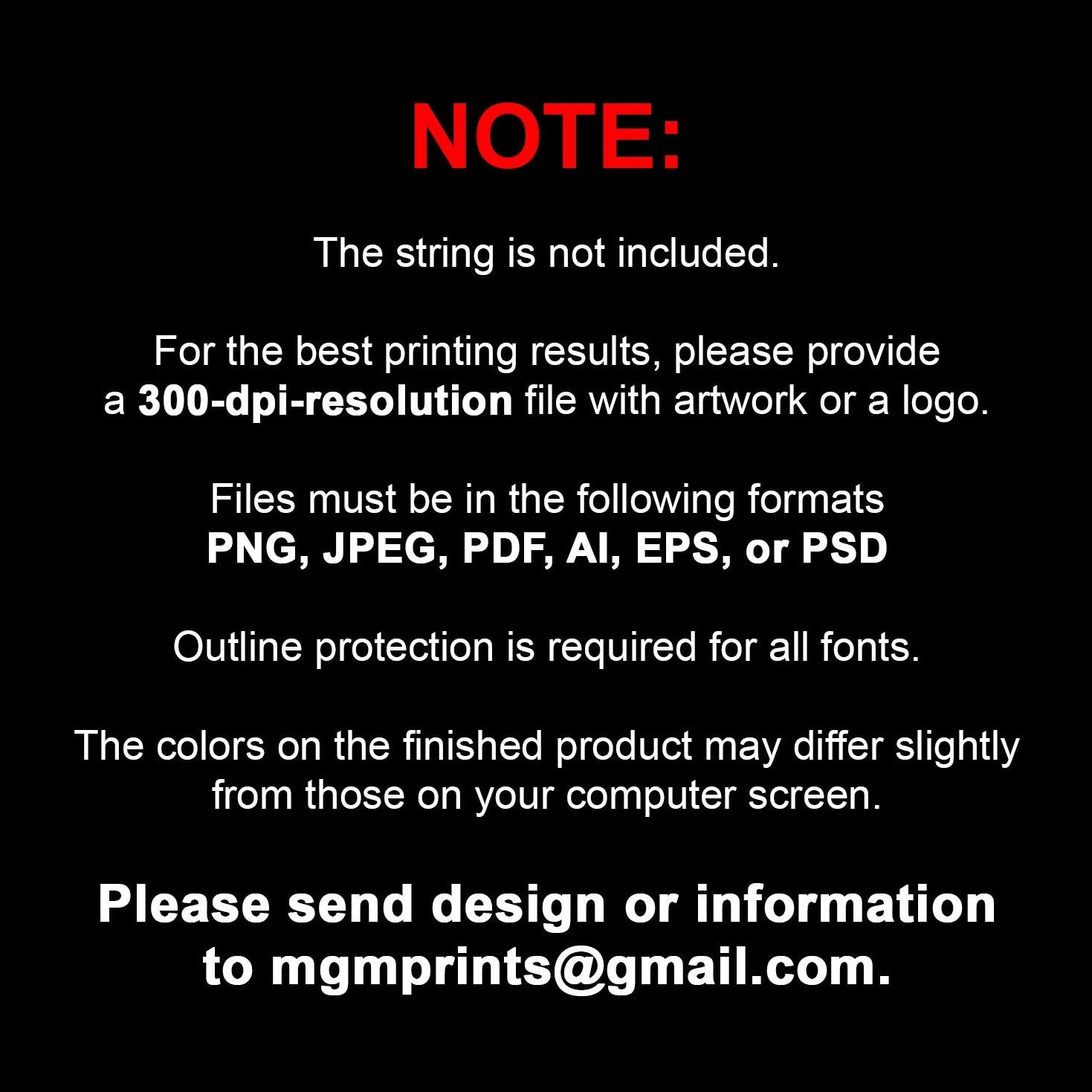 We accept the following file formats: JPEG, PDF, PSD, PNG, AI, EPS. Images should be a minimum of 300 dpi.