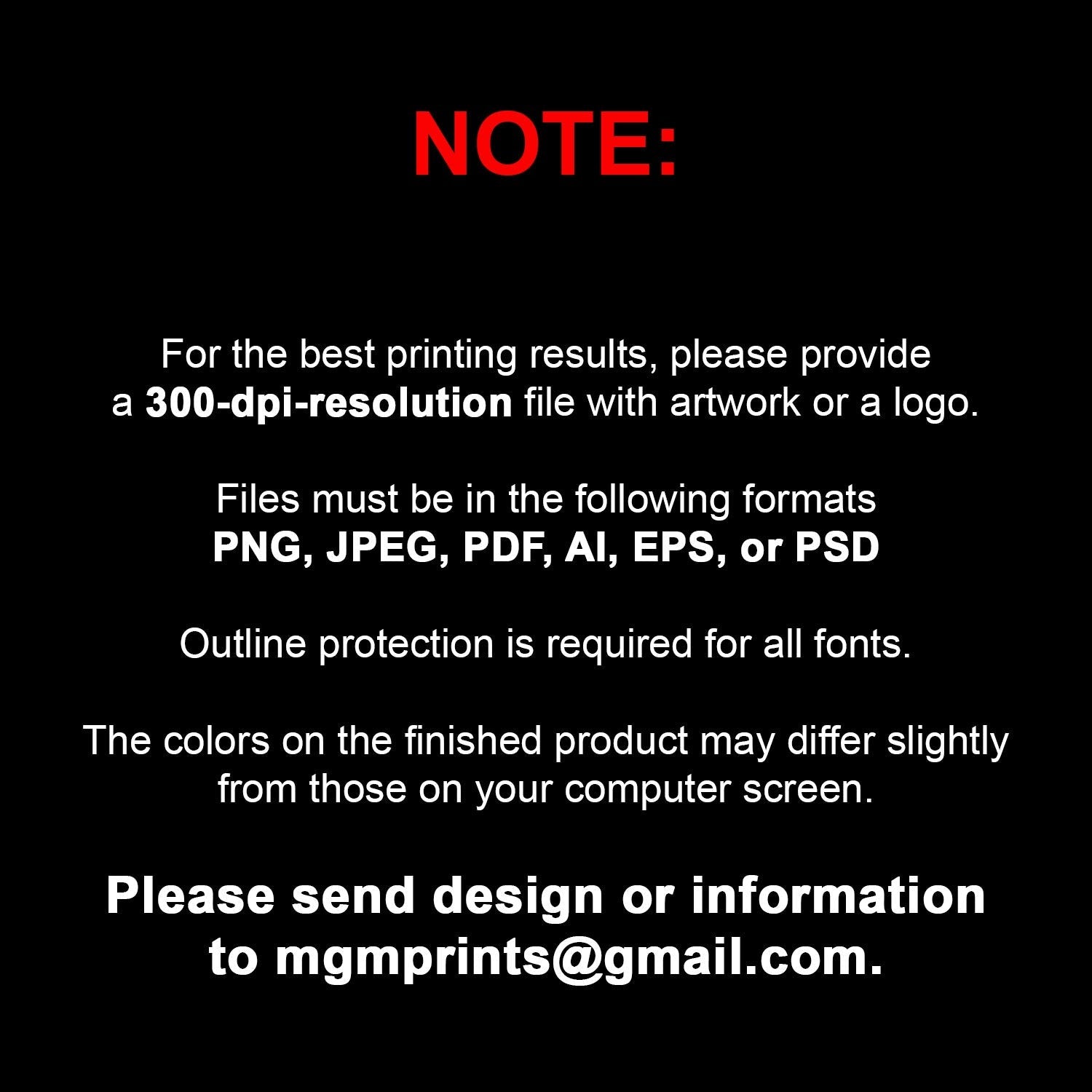 We accept the following file formats: JPEG, PDF, PSD, PNG, AI, EPS. Images should be a minimum of 300 dpi.